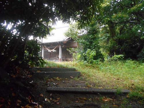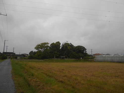 晴れていればキモチよさそうな水田と用水の間を行くと、集落の真ん中に繁みと鳥居があります。これが高柳の神社古墳。