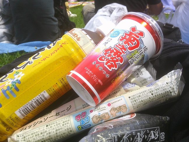 琉球泡盛菊の露もラインナップに!おきなわの知り合いのみなさん、ありがとう。芝生の外野席だからごろごろ寝られる・・・はずが雨でしっとり濡れていた。