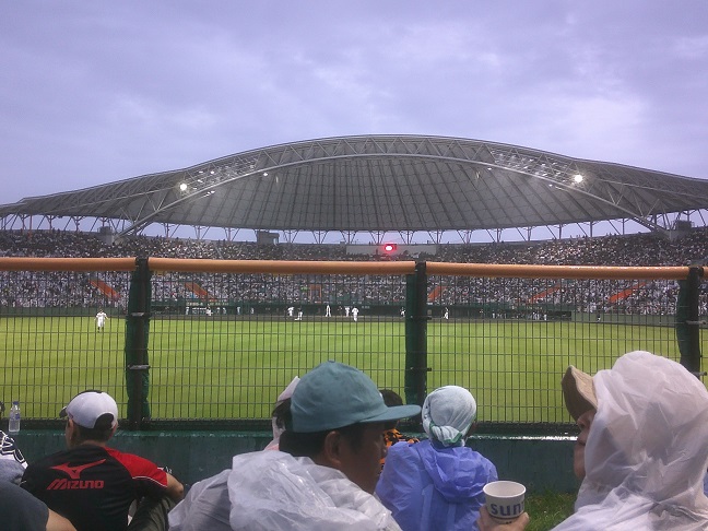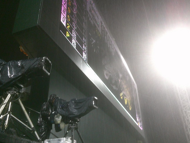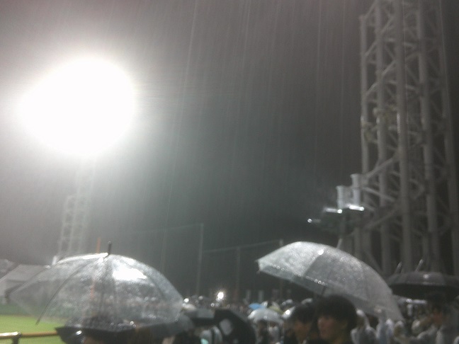 五回の整備終わって六回に入ろう、とした瞬間にすごい雨になってきて、中断。十分ほどで牧田さんが出てきてコールして、試合終了。よく濡れた。
