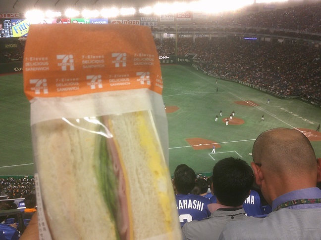今日はサンドイッチでも食うか。カリステに打たれて堀田降板の場面です。何食っても太るんですよねー。右下のひとやはり気になります。記録つけてるとこですよ。