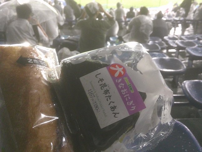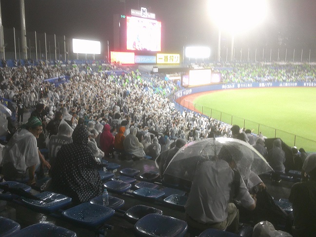 リレー終わったあと土砂降りからさらにイヌとネコが降ってくるような雨に。六回の表の開始などできず、風が強く、あちこちで傘がひっくり返ったり、ゴミが飛んだりする。マリサポはその中でもほとんど引き揚げずに応援歌歌って飛び跳ねている。連勝中の集団催眠みたいなものかも知れない。