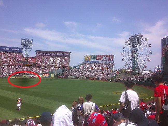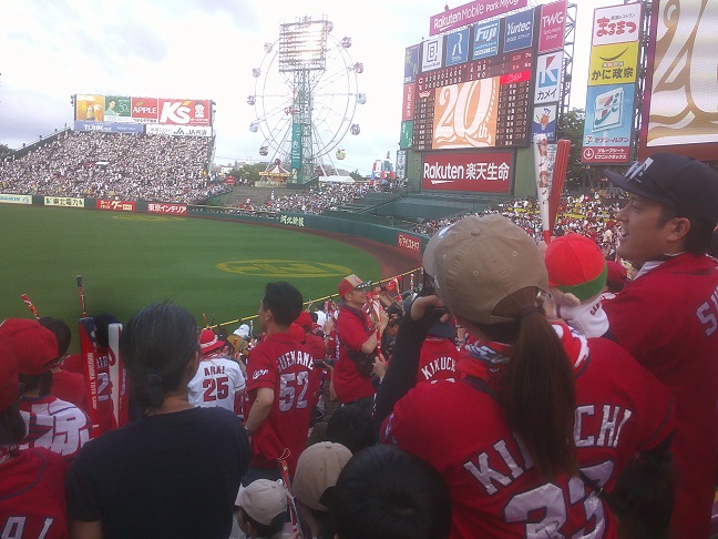 今日もいい天気です。天気もいいし、三日続けて「満員御礼」。前の列の楽天ファンのおにいさんが、「こんなに入ったのを見たのはじめて」というぐらい普段は入らない?みたいです。このあたりはライト側なのですが、両チームファンの共住になってて、普段は楽天ファンの方が多いんだそうですが、この三日は「居心地悪い」けど「カープの応援かっこいいな」とのことでした。いろいろ刺激を与えあっていくのでしょう。