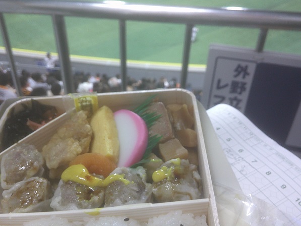 この状況でもしゅうまい弁当食う。スコアブックつけてるので周りの人がどんどん声をかけてくれます。原初的な野球ファンの世界だ。みんな若いなあ。みんな働いたり二留したりしているのだ。