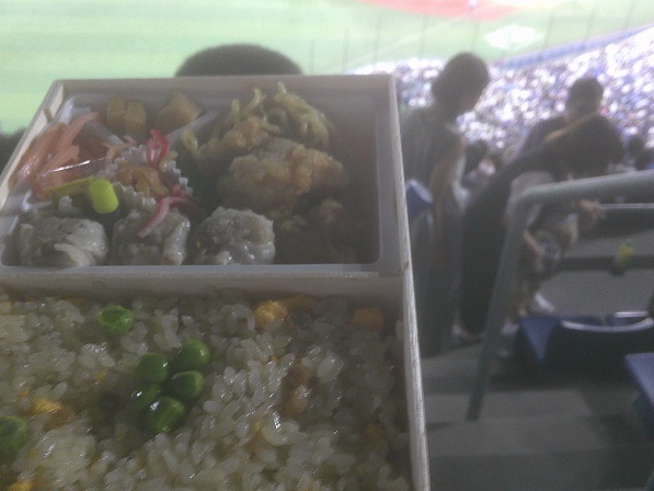 こんな内容です。しうまい弁当より少し小さいのですが、値段はしうまい弁当より30円高い。このHP見ている人に、「このひといつも同じもの食べてる、変な人だ」と思われないように変えてみました。ところが、食べ始めたところで牧二ゴロ、宮崎初球遊ゴロ併殺でチェンジに。九回表も一生懸命食べて一死一塁の時にやっと食べ終わりました。一死一塁は一球で試合終了し得る危険な状態だったのだ。