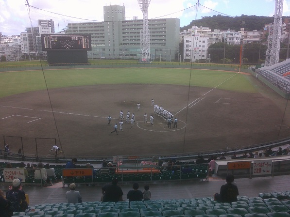 第一試合みたいにレベル高くないと思いますが、それなりに出来上がったチーム同士で好試合になりました。両チーム足の攣る子が出て何度も中断しましたが、12人しかいない八重山農林は交代ができないみたいで、11安打打って後半は押せ押せだったんですが、力尽きた感じです。八農のエースの上地くんというのは足も速くてこんなのがあと三四人いたら強いよね、と思いました。