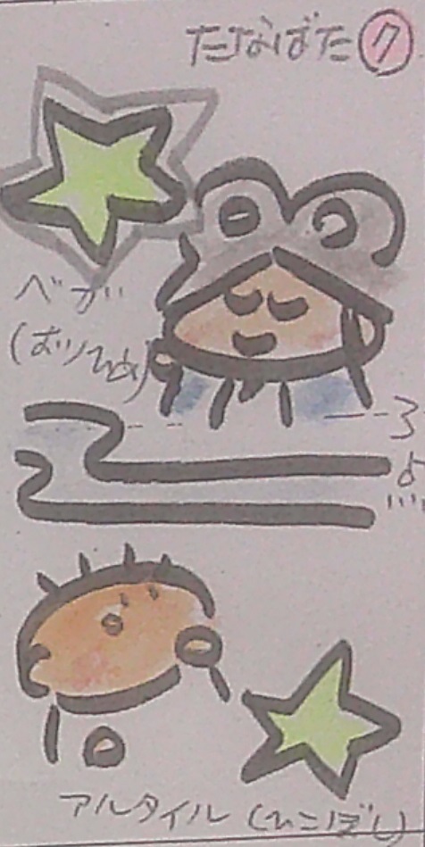 ある説によれば、天の川の中にぴかぴかと光る真っ白な気体(のようなもやもやした部分)があるが、それが五色(赤白黄青黒)に輝くように見えたら、願い事がかなうしるしなのだ、と。