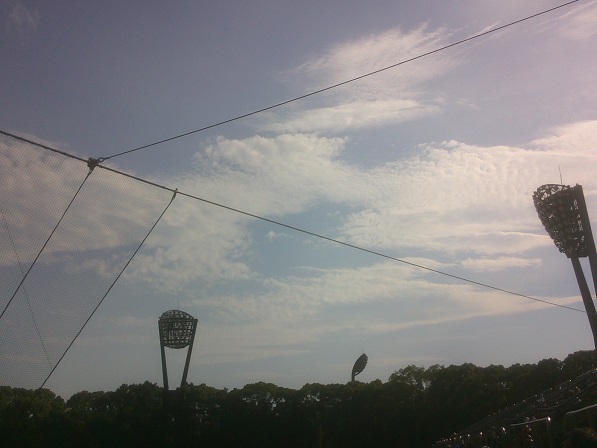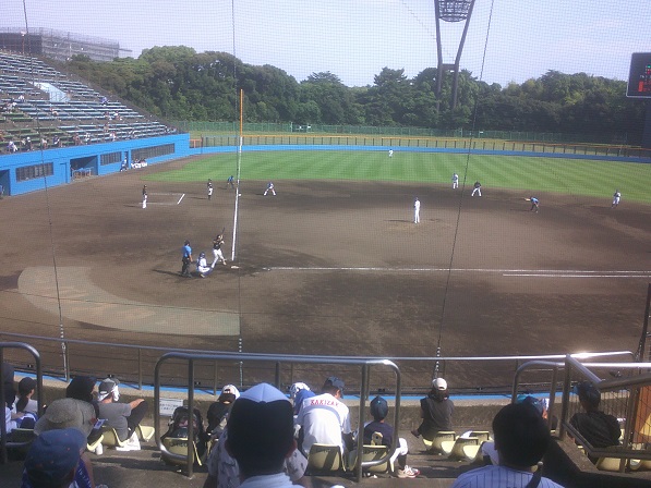 関東地方も暑い。この球場は大きな銀傘があるので、その隅っこに入れてもらってなんとか一息。内野の一番上まで行って大山阿夫利に雲がかかっているかどうか確認したいが、位置エネルギーを増やす余力なし。