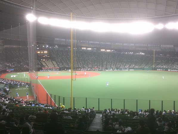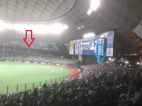 外野もこれです。赤のホーム側と青のビジター側を比べてみてください。ハム側がたくさん入っているというほどではないのですが・・・。