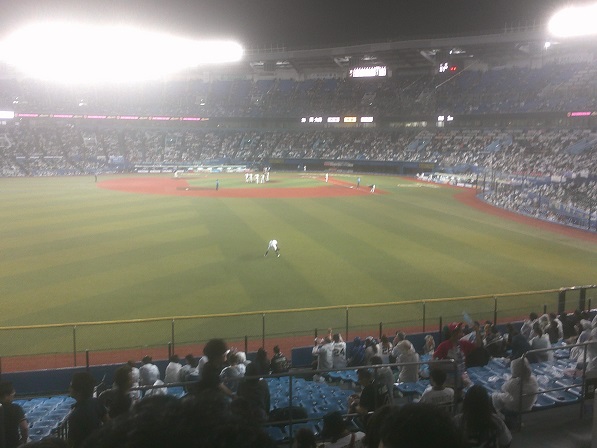 やはりここまで遠いですね。特に駅から遠いので所沢より遠く感じてしまう。七回表二死にやっと到着。今年はどこも展開早いので八時にはもう終盤の半ばぐらいだ。なお、写真は七回裏マリン二死一二塁でマウンドに集まるオリナイン。