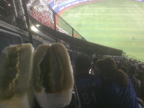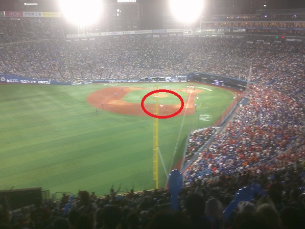 到着直後、六回裏ベイス二死満塁のところです。東の調子からいってほんとに一点取ったらいける!というところだったが。