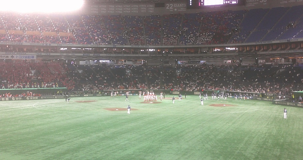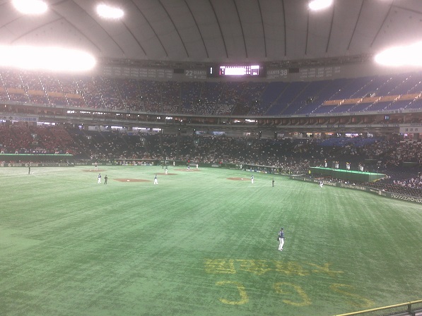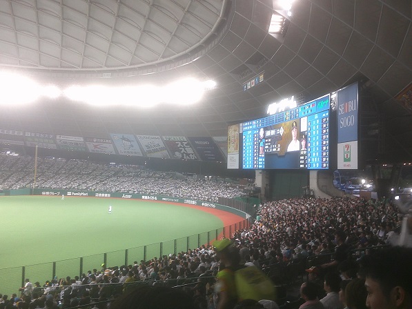 まずは昼の東京ドーム、今日はどちらも大入りでスコアボード横でそっと見てました(今年は全席指定に形になっており、ライト側の席の方が空いているかと思って、レフト側の方が少し隙間があるかなとレフト側に来てたので肩身が狭かったのです)。