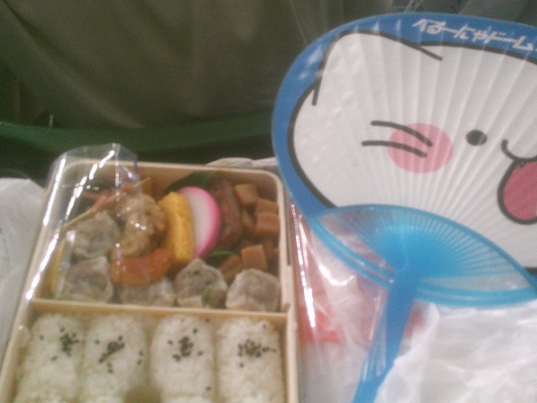 今日は昼間がサラダとアイスクリームとコロッケだけなので、夜はこれを食べる。一日に一食だけのまともな食事なのだ。ベルーニャのうちわももらいました。