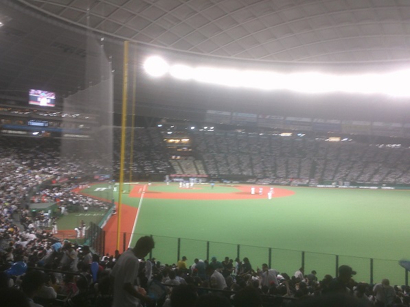 夜は驟雨の中、所沢山中の「全天候型野外球場」ベルーナドームへ。試合前半は激しい雷鳴も聞こえる中での試合になりましたが、湿度がすごくて球場ももやってくる始末。