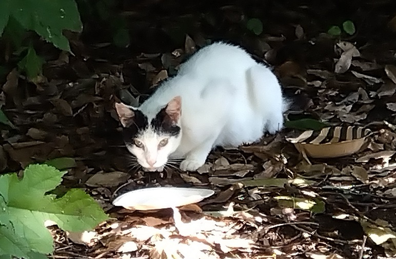 今日は昼間はどこかの喫茶店で明日のプレゼンのための勉強をしようと思ったんです。その前に、ふと戸田のネコ見に行くかと思い、エサと水入れ持って出かけてしまいました。暑い中、縄張りを持っているネコは見回りに行ったのではないかと思いますが、縄張りを失った下克上されネコが元気に?居残っていたのでメシを食わせる。