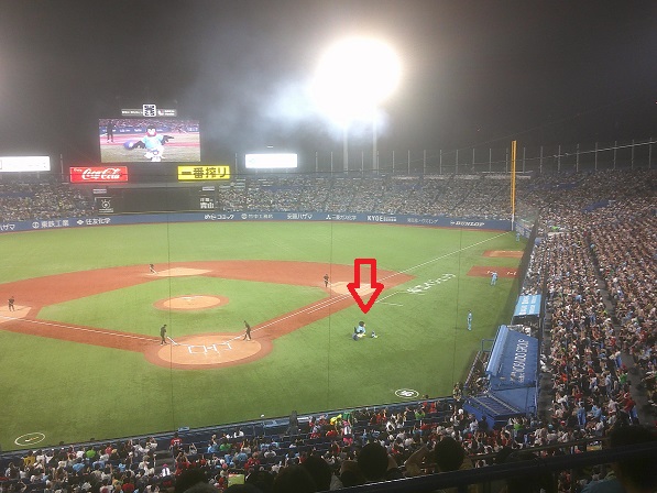 つばくろう空中くるりんぱ、今日は球場DJのパトリックが「これまでで一番成功に近づいた」というとおり、ほぼヘルメットが一度頭にかぶさりかけたところまで行った。判断次第では「成功」でもよかったかも知れませんが、成功時の対応マニュアルとかまだ用意してないのでしょう、失敗したものとして処理されました。明日は誰が見ても成功してしまうかも知れません。