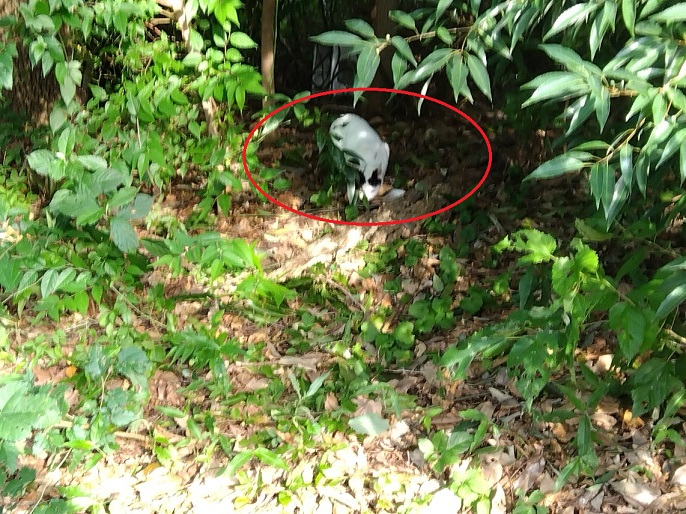 心霊写真みたいですがこれ以上近寄ってこないのでこの距離です。先週もいた「パンダ模様」の「下剋上されネコ」が下向きになってエサを食っているのがわかるでしょうか。今日みたところ、こいつおなかにも新しいケガがありますね。
