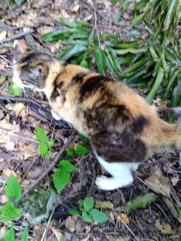 これは先週はいなかった下剋上ネコだ。かみなりが鳴り始めたので縄張り見回りから早めに帰ってきたのだが、途中で肝冷斎を見つけて、棲み処方向に誘導しながら「しりたたき」を要求する。「地域ネコしりたたき機械」化です。中腰で十分ぐらいしりたたきをしていましたが、頭がくらくらするし、次のノルマもあるので、お許しを願って帰ってきました。睨むので、一番高いかつを一本を差し出す。
