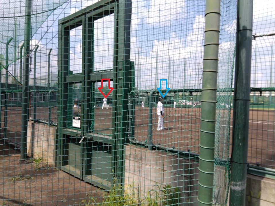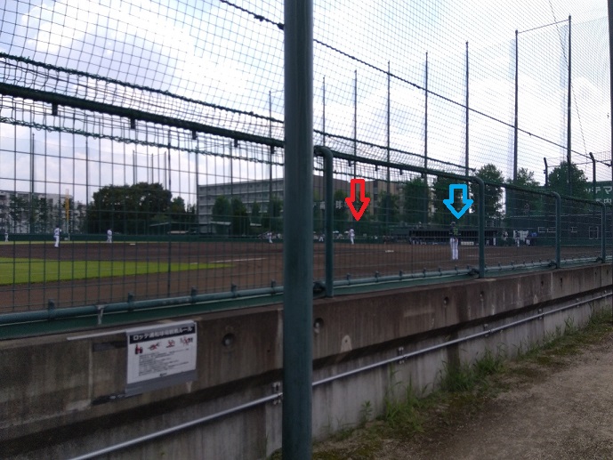 こちら一塁側の門を入ったところ。赤矢印が打席、青が一塁コーチャーです。こちら側にスワロの追っかけの人とかいます。戸田よりも選手が近く、帰るときに必ず道路を通るので、追っかける名所となっています。