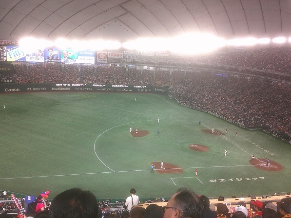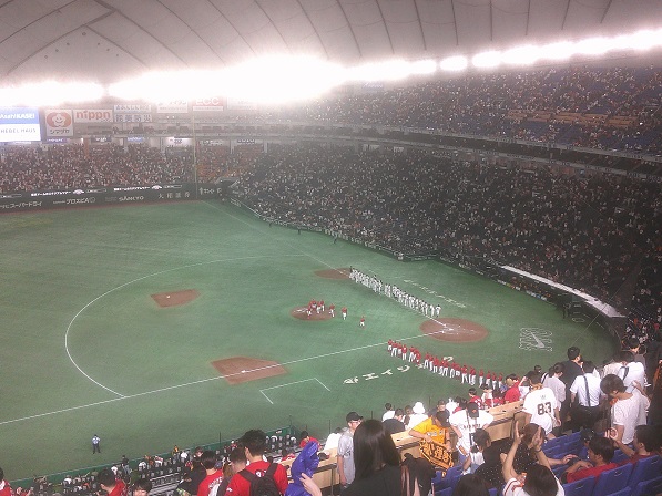 今日はいつものこのへんです。試合開始ごろから、ドームの外から雷鳴が激しく聞こえてきました。