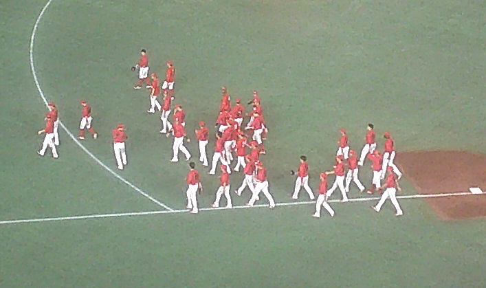 東京ドーム最終戦なので外野に向かって挨拶に行くカープのひとたち。今日みたいな野球やれたら楽しいね。