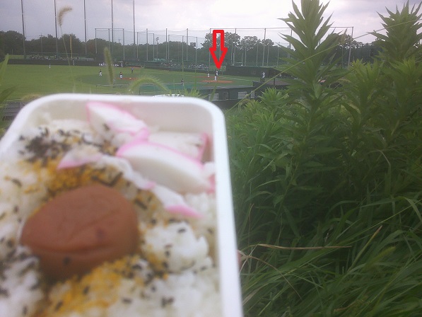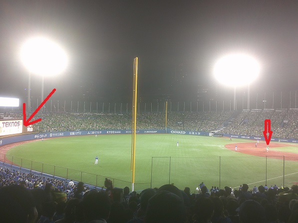 矢印の部分、村上さまが塁をお回りになっておられます。左側のあたりにお放り込みになられた。投手・石田裕。