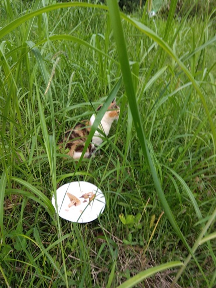雨が降ってこないので、そのまま戸田ネココロニーに行きます。草刈りが行われたようでかなり生物相が変わっており、一匹も発見できず、今日はネコのるま失敗かと思われたが、餌やり場に下剋上三毛がいました。