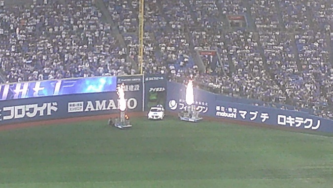 九回表に投手が出て来るときにこの炎のイベントをやります。山崎の登場時の「山康ジャンプ」とセットでやってたのに、クローザーが森原に替っても引き継いで、さらにセーブ条件の無いときでもやるようになった。炎の出方がこの前来たときよりよくなってますね。