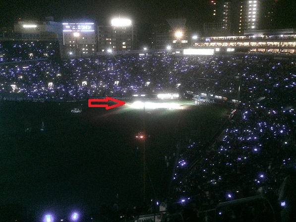 終了直後にこんなになりました。以前はヒーローインタビューの時に電気消してたのに。矢印のところには横濱ナインが並んで挨拶しています。