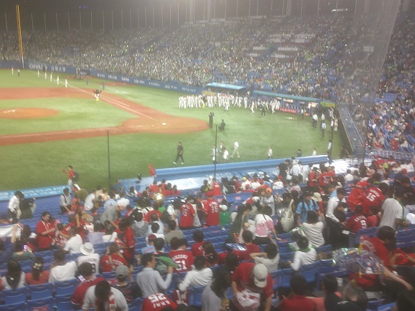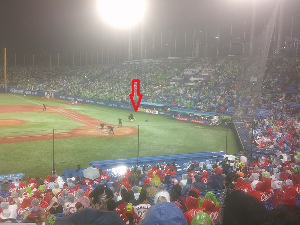 引退表明した青木が代打に。ヒットで、このあと決勝のホームも踏む。少し雨が降って来た。