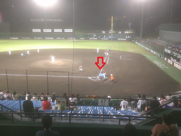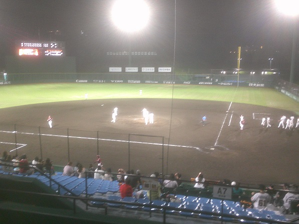 夜だけど暑い。アンパイヤ、やっぱり青いふつうの着てますね。