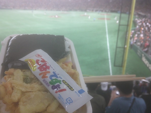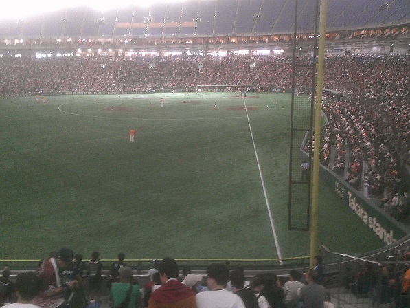 試合開始時点では二階席を開けてくれなかったので、ここで観戦します。前売1000円に惹かれて自由席を買いましたが、手数料が+300円+消費税つきました。コンテンツと関係ないところで「中抜き」してくの、この十年ぐらいで「当たり前」のようになってしまいましたが、他の国でもそうなんでしょうか。次の選挙こそは・・・。