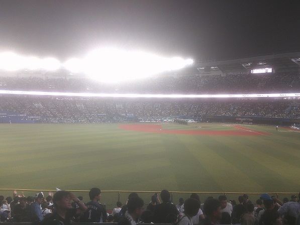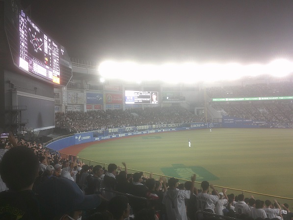 ライオンズファンもやけくそめいた熱心な応援を続ける。単純ゆえに後を引く(いつまでも忘れらない)応援歌が多いのもこの両チームの特色である。