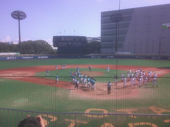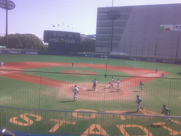 七回、筑波大・岡城の3ベースでほぼ決定的な4点目、5点目が入ったところ。暑そうです。
