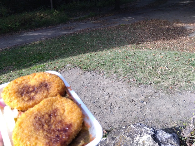 お金ももったいないので弁当だ。このコロッケ二個はマイバスで130円+税で買いました。ちょっとぱさぱさしているが、何も食わないよりは美味い。ソースはかなりかけた。
