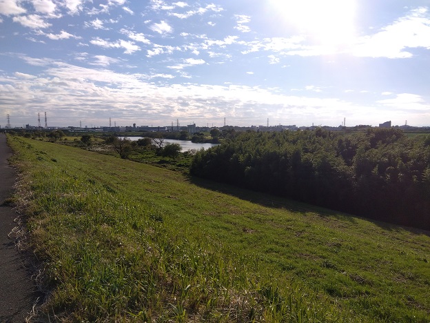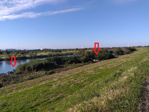 彩湖公園の一番奥の堤防に登ってみます。この堤防の西側は荒川。彩湖公園の管理の外になるらしいので、ネコでなく、人間も暮らしています。矢印のところに段ボールなどで作られたハウスがあります。