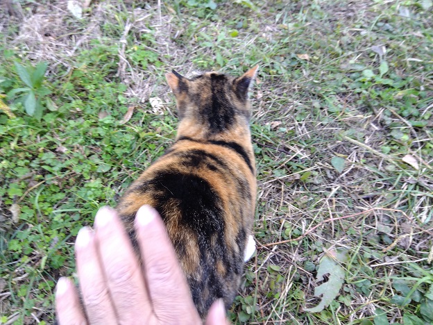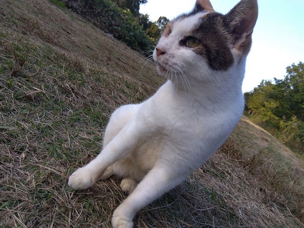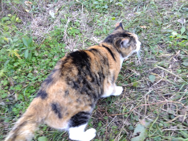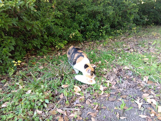 これは堤防から右下に降りてきたトイレの近くにいる「ミケ」。会うのは二回目です。実は以前、下の「しりミケ」がここまでエサをもらいに来てるのだと思って、しりをたたこうと追い回したことがあります。今回、「鳴き声が違う」ことに気づき、かつ他のえさやりさんに「奥のやつには会ったか」と訊かれて、はじめて「奥のやつ」(しりミケ)と違うことがわかりました。