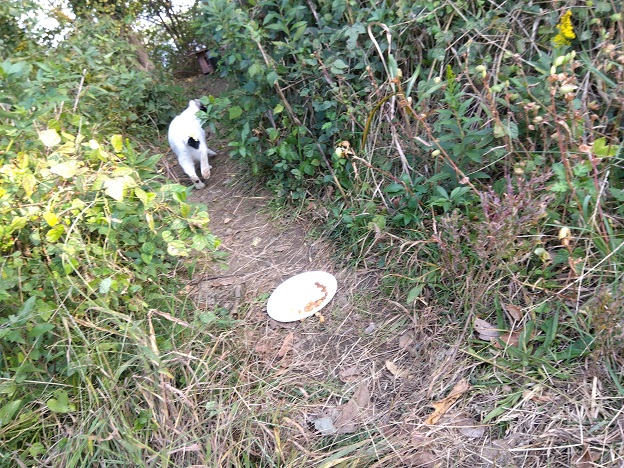 斑点ミケのしりたたきをさせられている時に、まったく気配なく背後に「ハチ」が来ていました。「ハチ」はしりミケと縄張り争い中のはずなのですが、ここにも来ていたとは。2メートルぐらいのところにエサを置くと不機嫌そうに食いました。