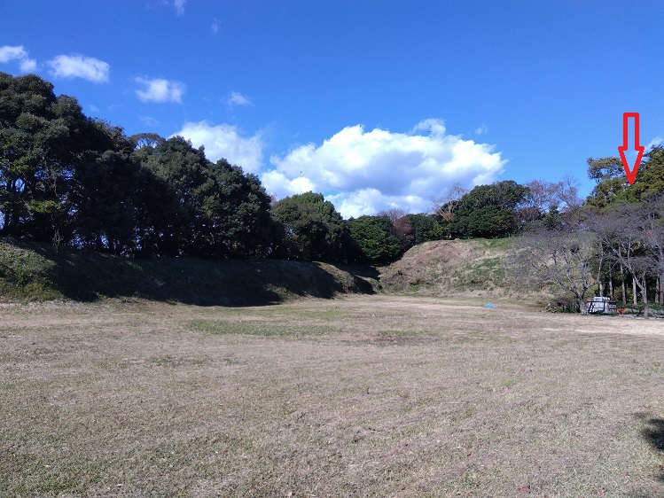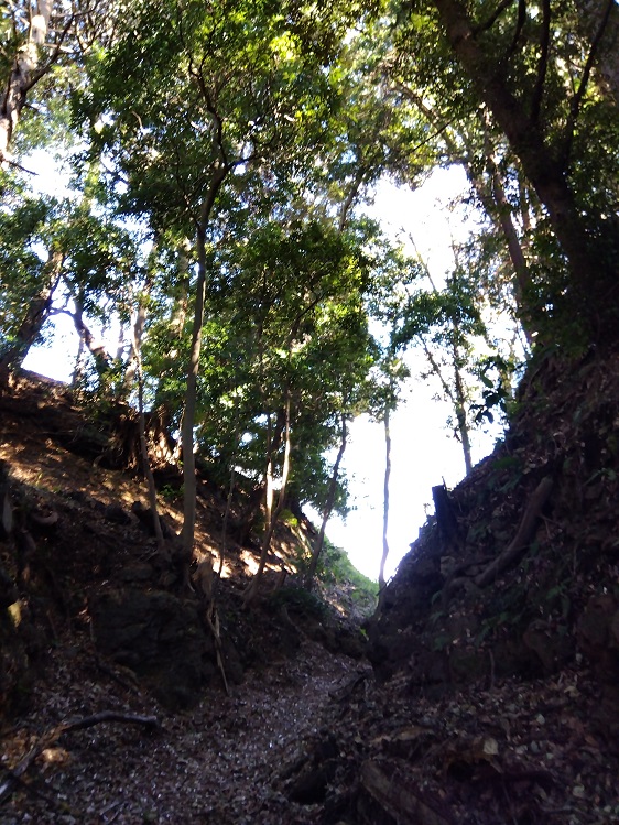 本丸、北曲輪間の大堀切。ここへ誘い込まれたらやられる。