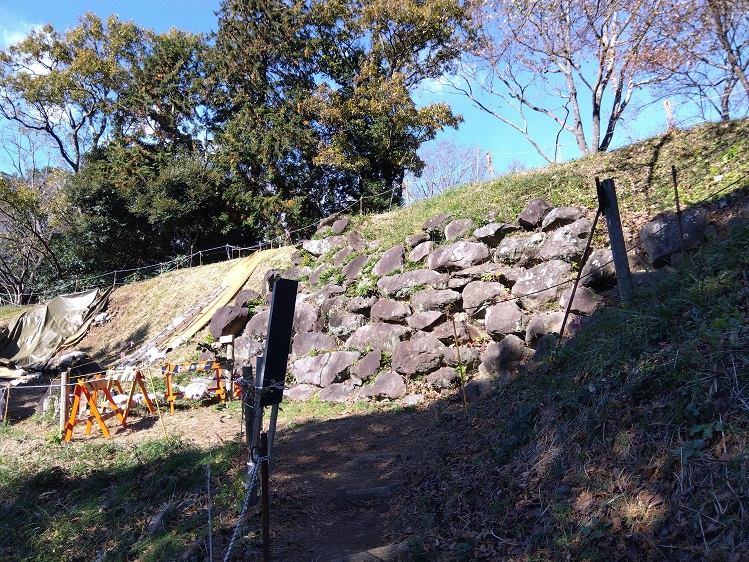 ここだけ石垣のある本丸天主台(瓦の無い建物が二棟建っていたらしい)。戦国期そのままの二つの時期の石垣が並んで遺っているのが見どころのひとつですが、左側の野面積みのあたりが整備中のようである。