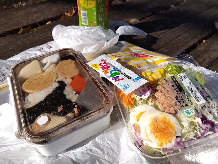 昼はこんなのを食べた。弁当におにぎりが入っているのは昨日の残りだ。炭水化物をして炭水化物を食べさせしめる。