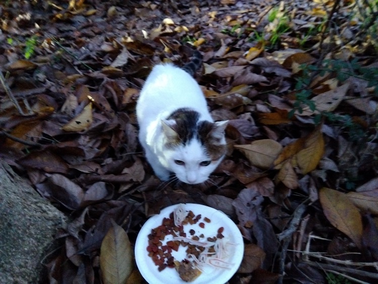 しりミケねこと向こうは「はち」だ。しりミケはエサよりもしり叩けだったが、ハチが来たのでエサを与えたらそれを邪魔しょうとしはじめたので、エサを与えたら自分も食い始めた。このあたりの思考回路はわからない。