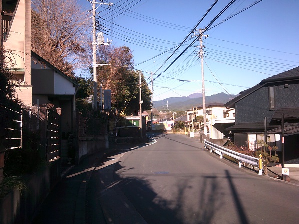 根方街道から北、富士方面に向かう道です。左手の林が御崎神社。