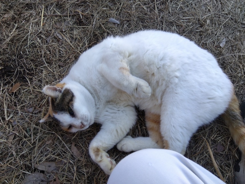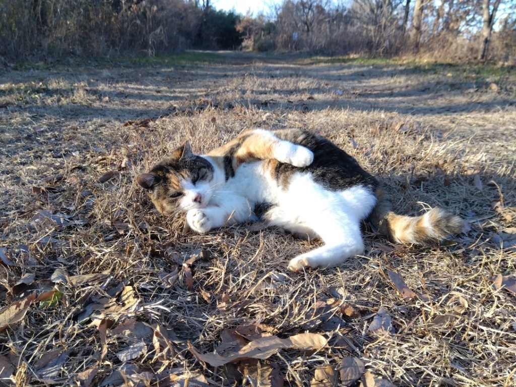 いつもの二匹を退治。これ以外のネコが見つかりません。他のえさやりボランティアの人に訊くと、とにかくカラスが狙うので(上の二枚の退治中も頭の上すぐ近くでカラスが何羽も舞っていました。エサやりのひとが置きエサすると狙うらしいですが、ネコも転がっているとやられるかも。一緒に転がっていると人間も?)、離れたところに避難したんではないかとのことです。