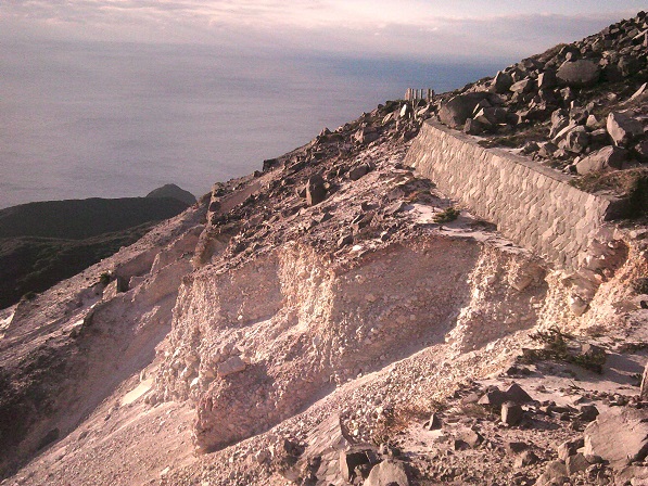 〇治山工事跡 ・・・ 標高500メートルの断崖上に、昭和の間、数十年にわたって山崩れを防ぐために人力で作られた治山工事の跡。平成年間にここから崩落。
