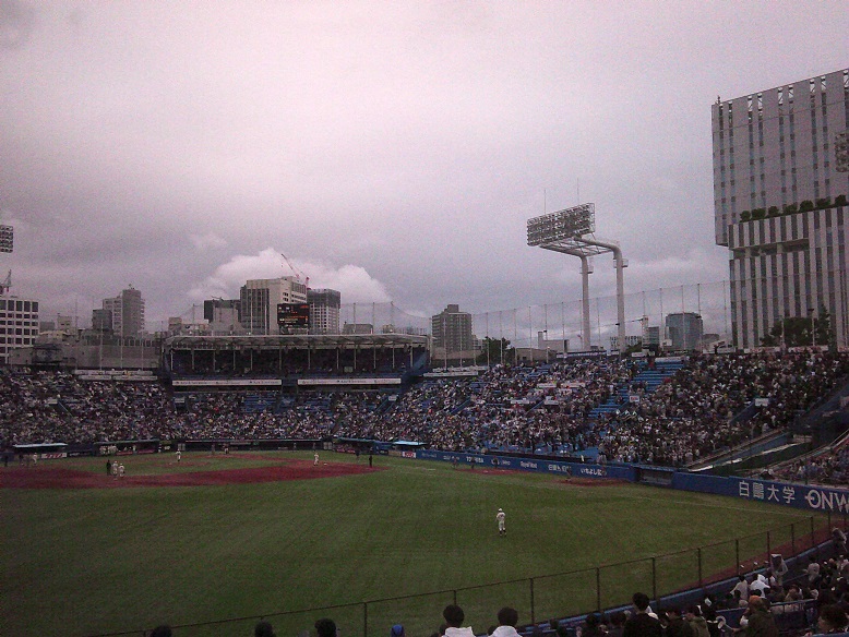 雨もあがりはじめた。神宮で早慶戦をやっているようなので、見に行きます。