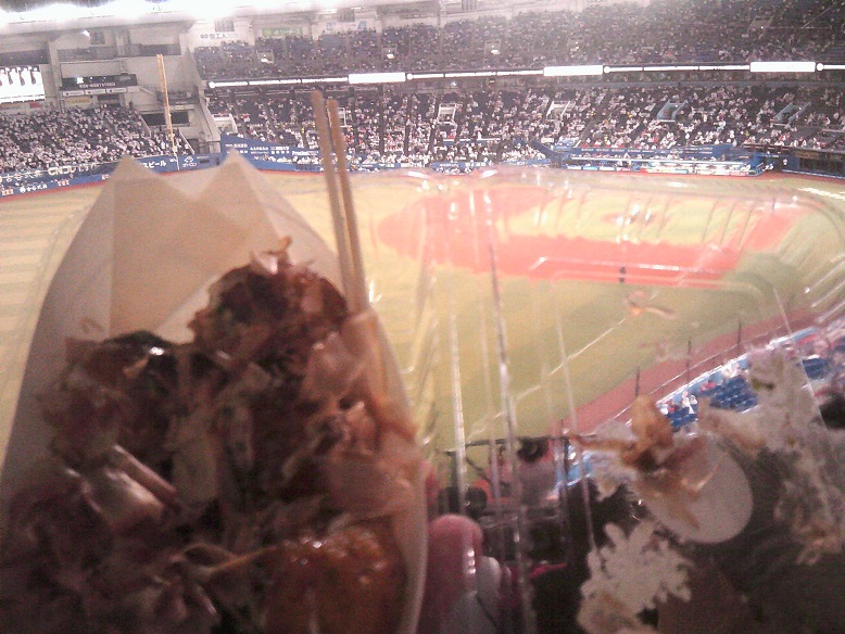 場内出店以外からの持ち込み禁止で厳しくチェックするので、もっといいもの豊潤にあればいいのですが、この時間に着くサラリーマンにはいろいろ不便なんです。これは700円たこ焼き。ソース美味いがタコ入ってない。タコ値上げだがウインナーかこんにゃくぐらい入れて欲しい・・・こんな国にしてしまったのはおれたちだからしようがないですけどね。