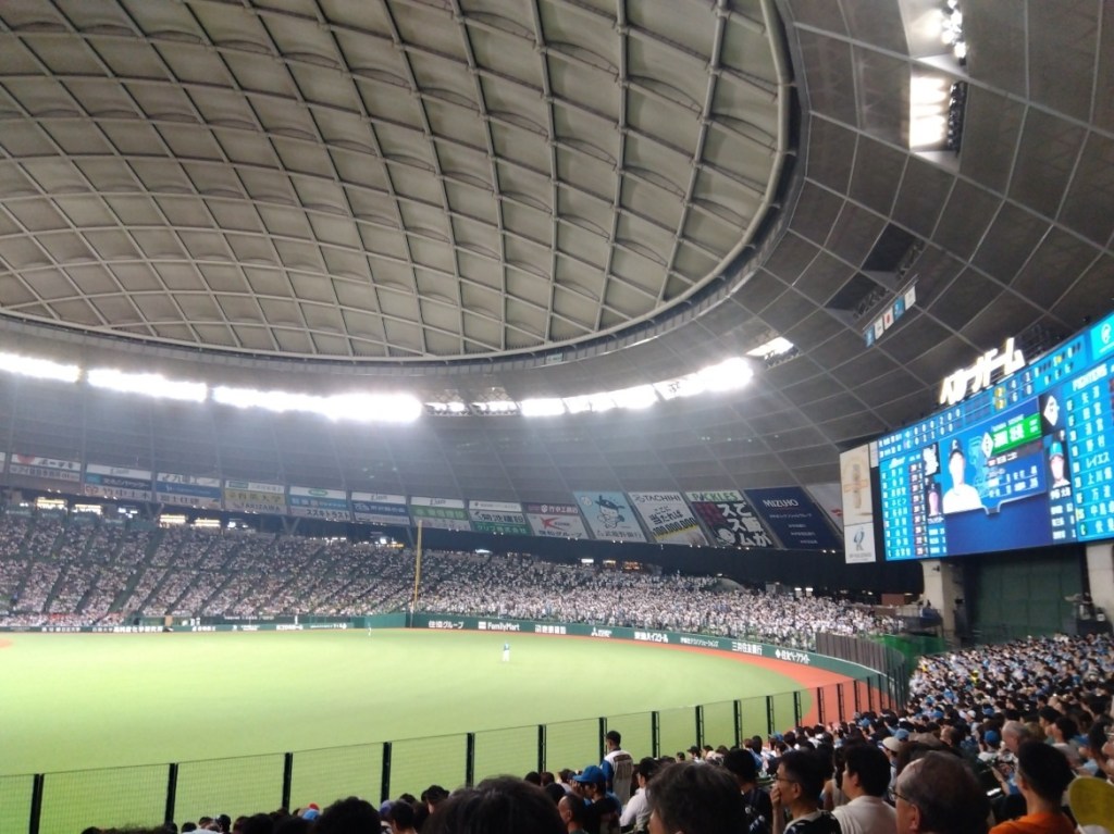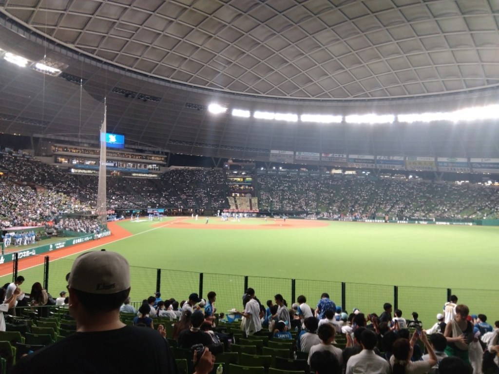 リーグ戦再開でいきなり今井・伊藤の投げ合いだというので緊張しましたが、電車の遅れなどもあって到着したときは六回表二死、今井が倒れて交代(熱中症といわれていますが)した後でした。西武の中継ぎがんばっていたが、やがて甲斐野のところで力尽き、万波の2点タイムリー2べース、山縣の犠飛で3点差、伊藤が八回125球まで抑えて、柳川がセーブ。西武は3点差ついたあと二日前イースタンでみた「ど地元」羽田が出てきて、1回3分の一を抑えました。なお、ハム田宮、ライオン渡部にホームランが出たとのこと。