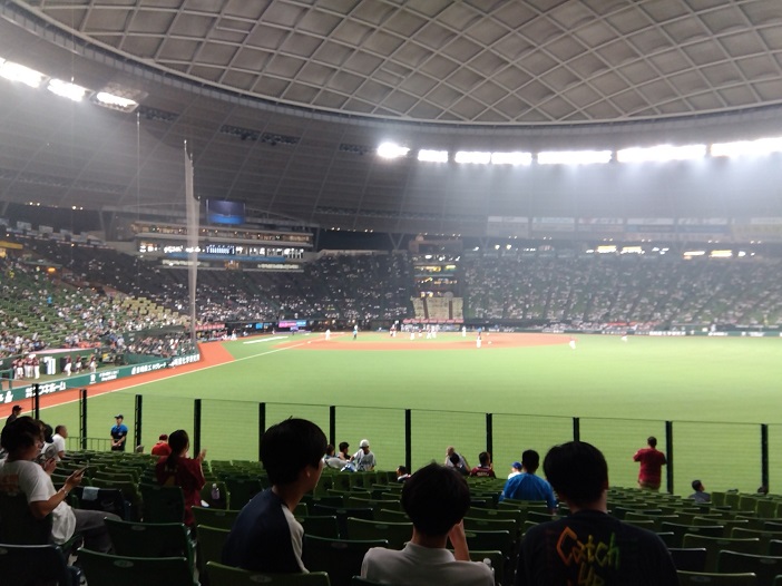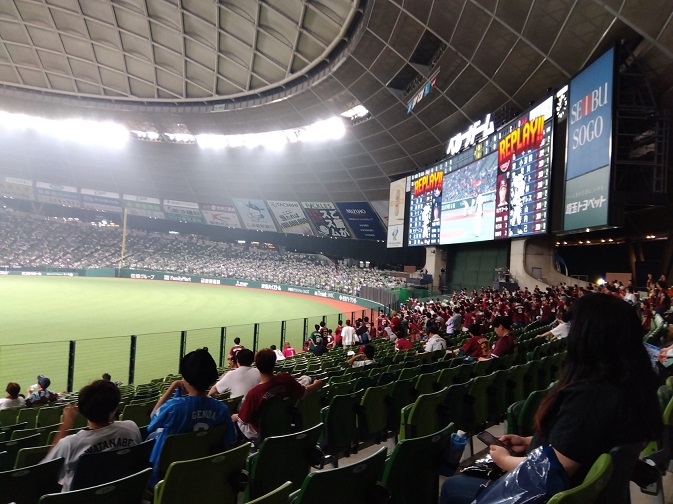 やっぱり遠いですね。みなさん通勤電車に揺られて毎日大変だなあ。六回表に到着しましたが、楽天が四回に3ホーマーで快勝。それはそれとして、ライオンズ、セカンド滝澤・ショート源田、いいですね。堅実だし派手だし、してほしい守備をしてくれる、といいますか。