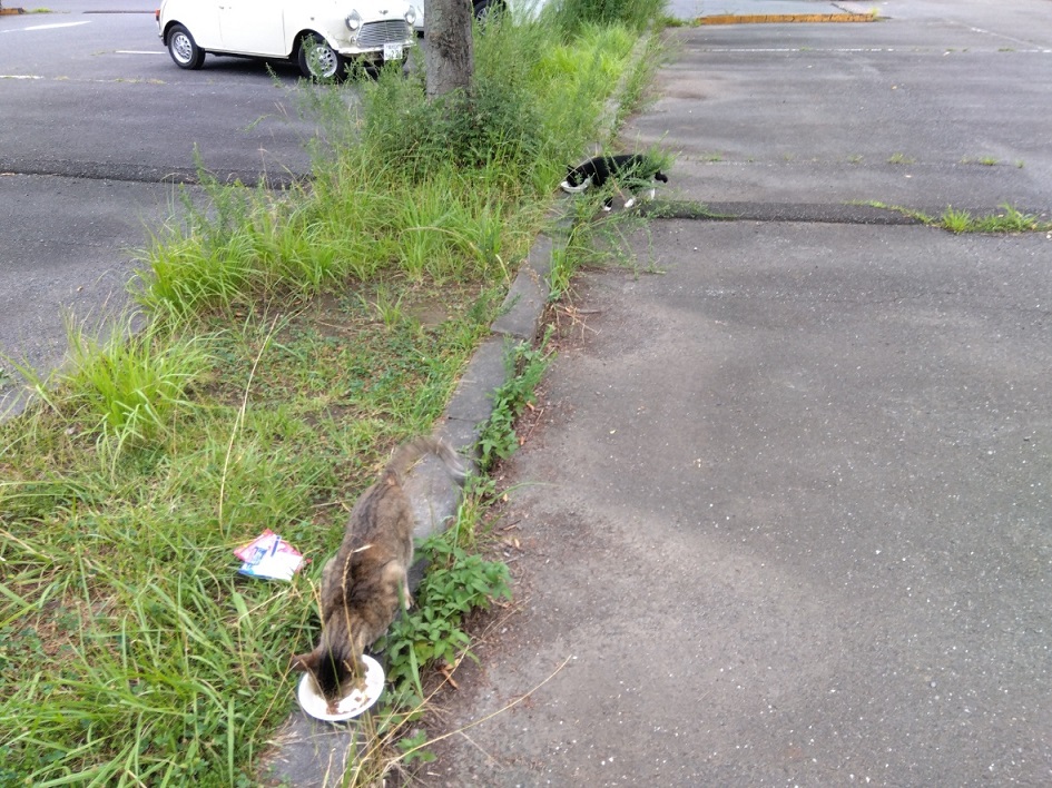 二匹やっつけて帰ろうとしたら駐車場に二匹いたので食わせます。こちらのは初めて会うはずですが(もしかしたら子猫のころに会っているかも知れない)なれなれしい。向こうにいるのは以前からいるびびりのタキシード猫だ。何びびってんだ、というぐらいびびっています。