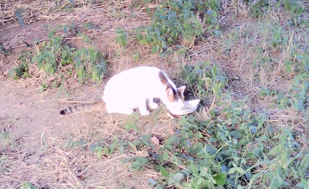 このシロネコは足が悪いので動かないことがわかりました。エサと水を置いてしばらくすると飲み食いして元気になって少し外に出てきます。しかし片づけようと近づくとすごい顔をして引っ込んでいきます。目のまわりにぶよがたかっているのがかわいそうですが、おれの知ったことではないからな。ひっひっひ。
